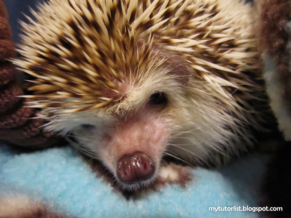 He's frowning a bit so his eyes are not a good comparison, but his nose is lighter... more liver coloured now (consistent with "chocolate" coloured hedgehogs), and he lost most of his dark mask. It's more pink now.